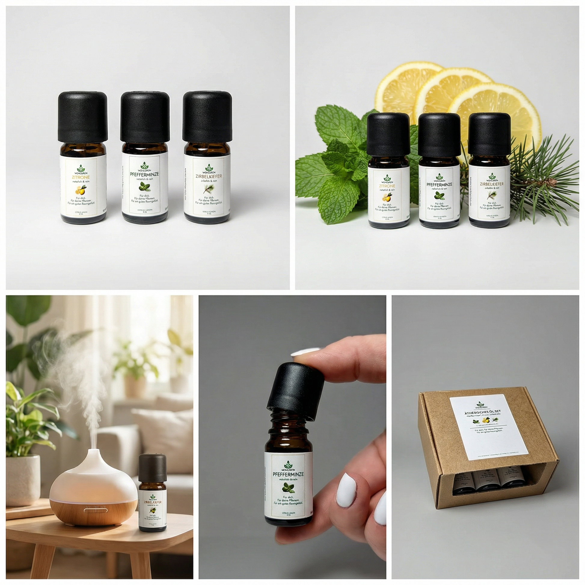WOHLGRÜN Ätherisches Öl Set (3×5 ml) – Zirbelkiefer, Zitrone & Pfefferminze